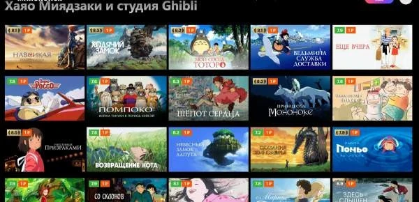 Среди доступных лент: "Ходячий замок", "Мой сосед Тоторо", "Навсикая из Долины ветров", "Ведьмина служба доставки", "Унесенные призраками", "Небесный замок Лупута", "Ветер крепчает" и многие другие.