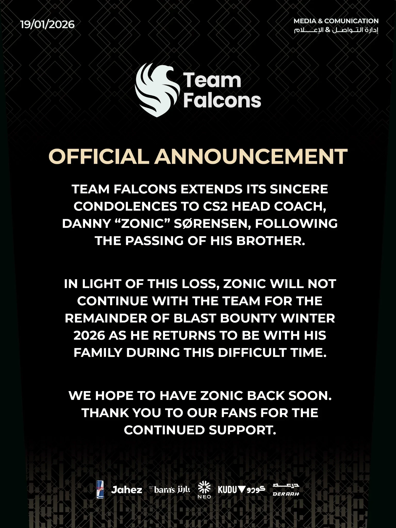 Легендарный датский наставник Дэнни «zonic» Соренсен не сможет руководить командой на Мальте. Организация предоставила Соренсену время, чтобы побыть с родными.