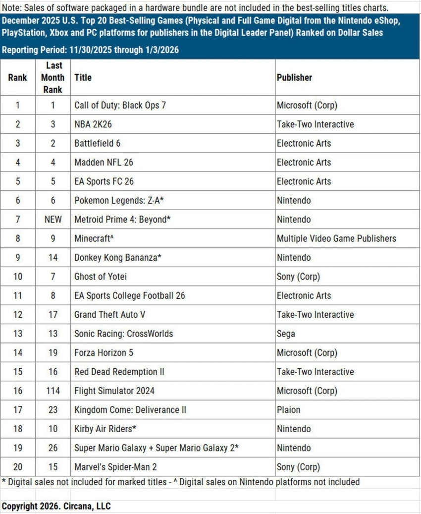 Обложка: скриншот Battlefield 6Известный аналитик Мэт Пискателла из Circana рассказал о самых продаваемых играх в США за декабрь прошлого года и весь 2025-й в целом.