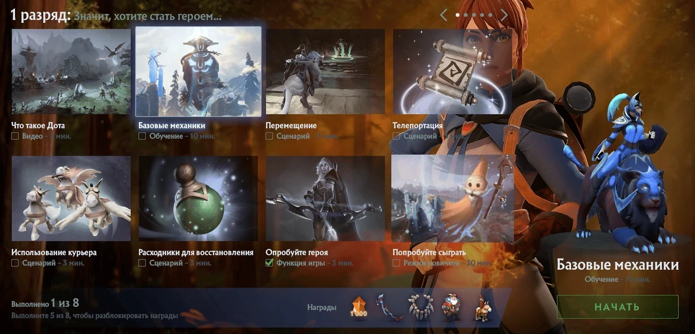 На сегодняшний день обучение в Dota 2 представляет собой набор гайдов, предлагающих игровой опыт в форме кампании. Их задача преподнести основы в виде линейного сценария. Завершение миссий награждает игроков бесплатным набором Gunslinger для Sniper и доступом к книге Archronicus, содержащей рассказы о лоре проекта.